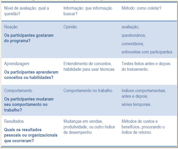 A eficácia de um treinamento pode ocorrer em diferentes níveis, sendo recomendado avaliar os resultados conforme o modelo abaixo:
